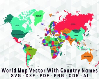 Detailed Map of World With Country Names SVG, DXF, PDF, Ai, Png Etsy